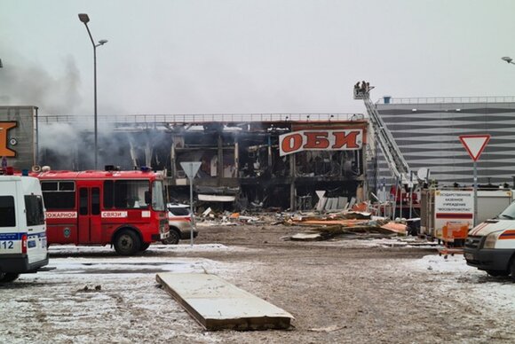Пожаром полностью уничтожен гипермаркет OBI. По последним данным, площадь возгорания составила 7 тысяч квадратных метров. Ранее сообщалось, что она была почти в три раза больше. Пожар начался около 6 утра на складе, где находилась мебель и деревянные конструкции. Затем огонь охватил всю площадь гипермаркета. Последовали взрывы, которые объясняют детонацией газовых баллонов и банок с красками.